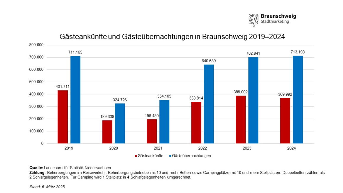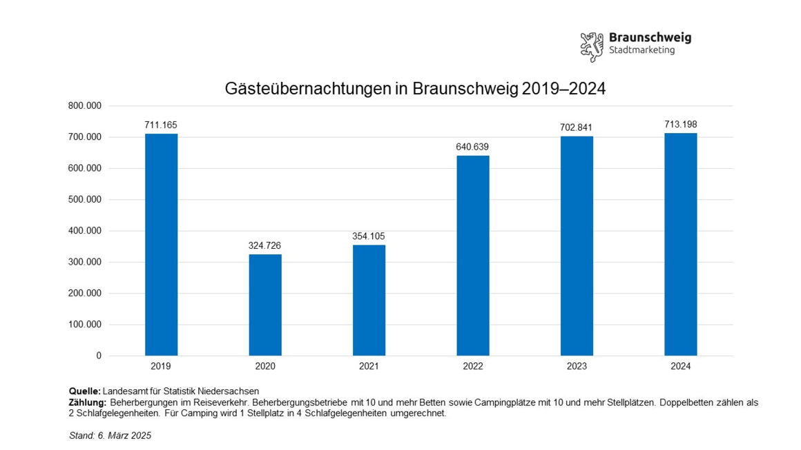 Das Tourismusjahr 2024 endet in Braunschweig mit einer positiven Nachricht: Das Landesamt für Statistik Niedersachsen (LSN) erfasste in der Löwenstadt im vergangenen Jahr über 713.000 Übernachtungen, was einer Steigerung um 1,5 Prozent im Vergleich zum Vorjahr entspricht. Die durchschnittliche Aufenthaltsdauer stieg gleichzeitig von 1,8 auf 1,9 Nächte. Damit liegen die Übernachtungszahlen erstmals wieder auf dem Niveau von vor der Pandemie.