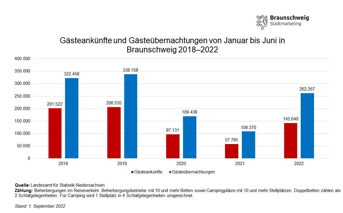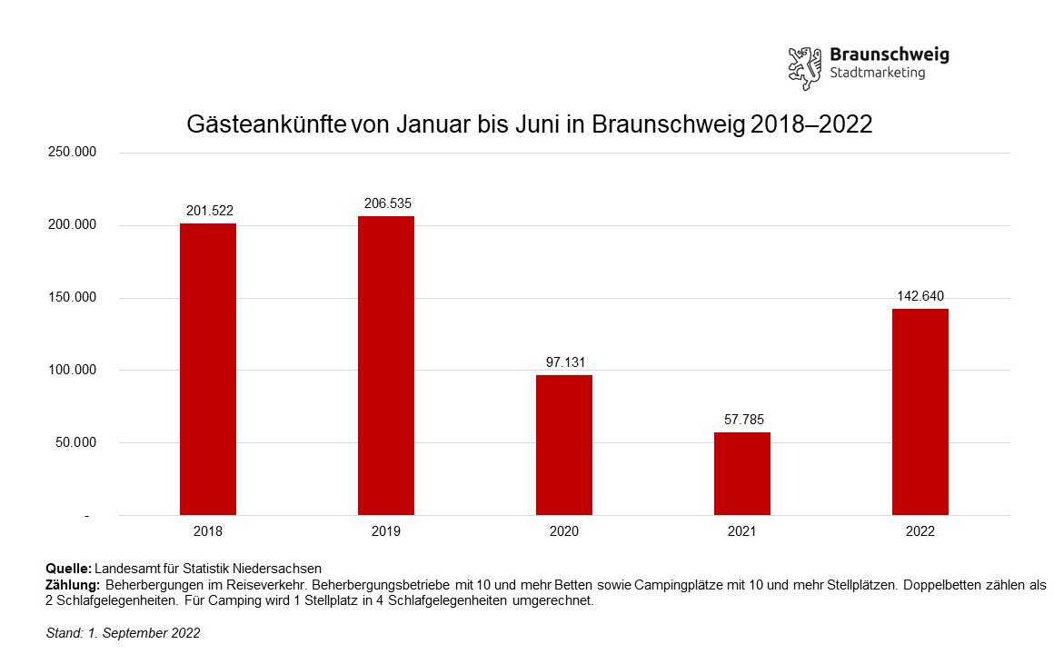 91.880 Gästeankünfte und rund 168.700 Übernachtungen hat das Landesamt für Statistik Niedersachsen (LSN) für das zweite Quartal in Braunschweig erfasst. Das bedeutet eine Steigerung der Ankünfte um circa 150 Prozent und der Übernachtungen um rund 160 Prozent im Vergleich zum Vorjahreszeitraum. Damit konnte das erste Halbjahr etwa 150 Prozent mehr Ankünfte und etwa 140 Prozent mehr Übernachtungen im Vergleich zu 2021 verzeichnen.